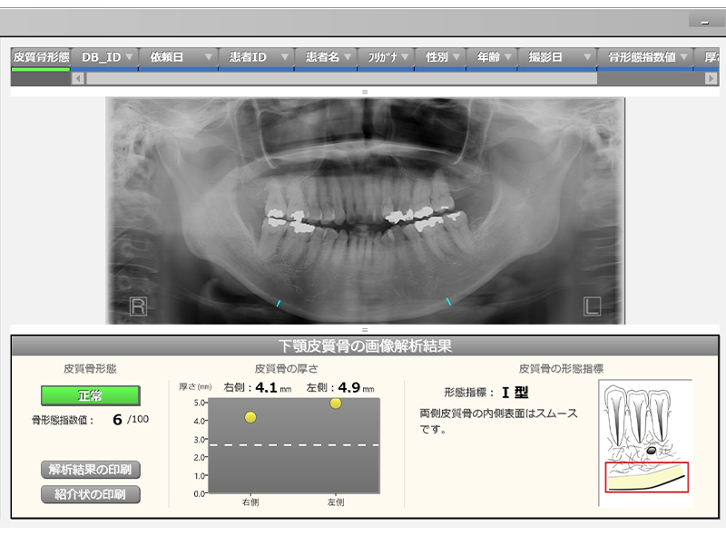 歯科パノラマX線画像をAIで解析し骨粗鬆症スクリーニング支援をするソフトウェアを用いて、骨粗鬆症スクリーニングの取り組みを行っております。スクリーニングの結果骨粗鬆症の疑いがあると判断した患者様に対しては、必要に応じて適切な医療機関をご案内いたします。